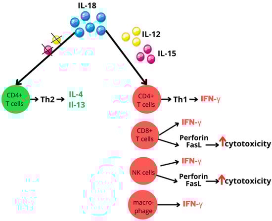 IL-18 activity modulated by IL-12 and IL-15 interplay. Figure abbreviations: CD—cluster of differentiation; FasL—Fas ligand; IFN-γ—interferon-gamma; IL—interleukin; NK—natural killer; Th—T helper; ↑—increased.