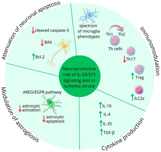IL-33 role in ischemic stroke. Figure abbreviations: AREG—amphiregulin; EGFR—epidermal growth factor receptors; IL—interleukin; ILC2s—group 2 innate lymphoid cells; TGF-β—transforming growth factor β; Th—lymphocyte T helper; Treg—regulatory T cells; ↓—decreased; ↑—increased.