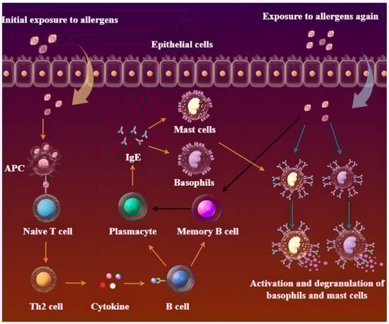 The process of allergic reactions. Antigen-presenting cells (APCs) process allergens that enter the body and further present them to T cells for activation (The yellow arrow represents the immune pathway following the first exposure to allergens; the black arrow represents the activation of memory B cells by the body in response to subsequent allergen exposure, leading to IgE production; the blue arrow represents the direct binding of IgE to allergens after the second exposure). Under the stimulation of specific cytokines, such as IL-4 and IL-13 secreted by Th2 helper T cells, B cells undergo proliferation and differentiation, leading to the formation of memory B cells. These B cells then produce and release specific IgE antibodies against allergens. Subsequently, these specific IgE antibodies bind to high-affinity IgE receptors on mast cells and eosinophil surfaces, inducing an allergenic state in the body without exhibiting corresponding symptoms. Upon re-exposure to the allergen, cross-linking occurs between two or more IgE Fc fragments on mast cells and eosinophil surfaces, causing degranulation of mast cells along with histidine release and subsequent occurrence of allergic symptoms [,,,].