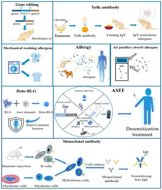 Methods for preventing human allergies to cats and dogs. A schematic diagram illustrates various methods for preventing human allergies caused by cats and dogs, including physical methods (such as mechanical washing, air purifier, etc.), a gene-editing technique, and immunological approaches (such as egg yolk antibody, holo β-lactoglobulin (holo-BLG), allergen-specific immunotherapy (ASIT), monoclonal antibody, etc.) [,,,,,,].