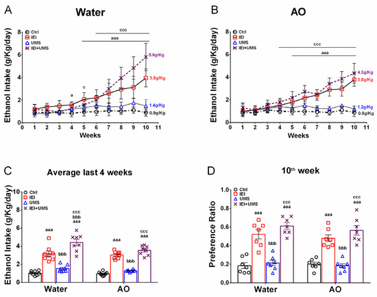 Home-cage voluntary ethanol consumption in a 2-bottle free choice test. (A,B) Weekly intermittent 20% ethanol intake in water and AO-treated cohorts, respectively. (C) Average ethanol intake over the last 4 weeks of the experiment. (D) Average preference ratio over the last week of the experiment of Ctrl (n = 12), IEI (n = 12), UMS (n = 12) and IEI/UMS (n = 12) with/without AO treatment. Results were expressed as mean ± SEM. (A,B): aaa p < 0.001, IEI vs. Ctrl; ccc p < 0.001, Ctrl vs. IEI/UMS. (C,D): aaa p < 0.001 compared with Ctrl; bbb p < 0.001 compared with IEI; ccc p < 0.001 compared with UMS, according to RM 3-way or 2-way ANOVA, followed by a Tukey’s test.