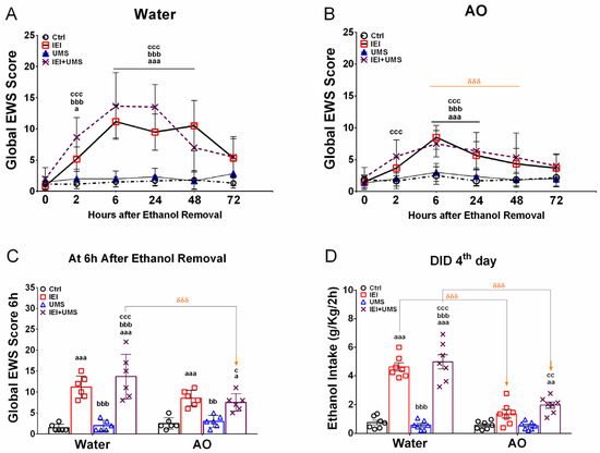 Ethanol withdrawal signs and binge-like ethanol drinking in the dark after 72 h of abstinence. (A,B) Global EWS (sum of somatic withdrawal scores across the five behavioral signs) measured between 2 and 72 h after the removal of the 20% v/v ethanol solution, in water and AO-treated rats, respectively. (C) Average of global EWS scores measured at the 6th and the 24th hours of ethanol removal. (D) 20% v/v ethanol consumption (g/kg/2 h) on the 4th day of the drinking in the dark test in water- and AO-treated Ctrl (n = 10), UMS (n = 11), IEI (n = 11), and IEI/UMS (n = 11) groups. The values represent the mean ± SEM. (A,B): a p < 0.05, aaa p < 0.001, IEI vs. Ctrl; bbb p < 0.001, Ctrl vs. IEI/UMS; ccc p < 0.001, UMS vs. IEI/UMS. (C,D): a p < 0.05, aa p < 0.01, aaa p < 0.001 compared with Ctrl; bb p < 0.01, bbb p < 0.001 compared with IEI; c p < 0.05, cc p < 0.01, ccc p < 0.001 compared with UMS. δδδ p < 0.001 AO effect, according to RM 3-way or 2-way ANOVA, followed by Tukey’s test. AO: Argan oil, EWS: Ethanol withdrawal signs.