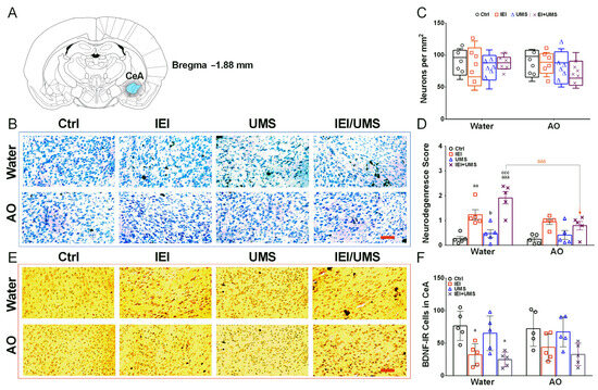 Histologic neurodegeneration and BDNF immunoreactivity analysis in the CeA. (A) Brain anatomical positions of the CeA, relative to Bregma −1.88 mm from the rat brain atlas [30]. (B) Representative images of Nissl-stained forebrain CeA sections. (C) Number of neurons per mm2 assessed by cell counting and (D) Semi-quantitative analysis of neurodegeneration (score) in rats CeA sections. (E) Representative images showing BDNF—immunolabelling observed in the CeA sections. (F) Positive BDNF-IR cell counts in the CeA sections in Ctrl (n = 5), IEI (n = 4), UMS (n = 5) and IEI/UMS (n = 5) groups under water or AO treatment. Results are expressed as mean ± SEM from 5 animals per group. a p < 0.05, aa p < 0.001 and aaa p < 0.001 compared to Ctrl group; b p < 0.05 compared to the IEI group; ccc p < 0.001 compared to the UMS group; δδδ p < 0.001 AO effect (water-treated IEI/UMS vs. AO-treated IEI/UMS). The data of neuron counting are illustrated as box-and-whisker plots. Scale bar = 50 µm. CeA: the central nucleus of the amygdala, AO: Argan oil, BDNF-IR cells: brain-derived neurotrophic factor—immunoreactive cells.