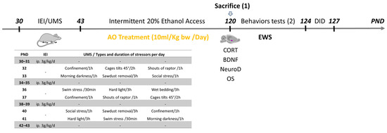 Some rats (five rats per group), were used only for histological and biochemical evaluations, immediately after the AO treatment period. These rats never underwent any behavioral tests. Figure 4, illustrates the treatment and behavioral timeline for rats undergoing adolescent IEI/UMS; the treatment conditions are defined in detail below.