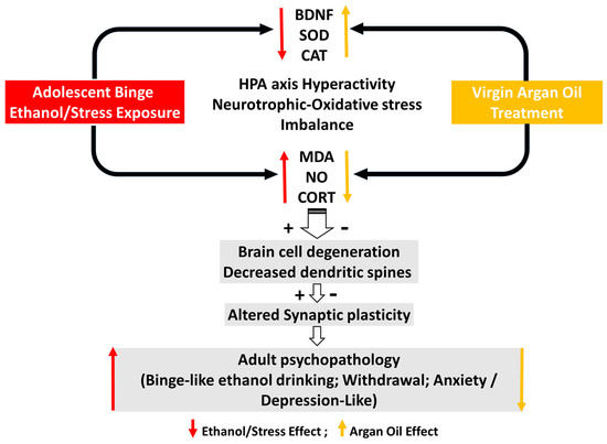 Recently, studies in 158 N and BV-2 nerve cells show that AO from Agadir and Berkane (the two main producing regions of AO in Morocco) is able to attenuate the cytotoxic effects of 7-ketocholesterol (7KC), which is increased in the brain of patients with Alzheimer’s disease: loss of cell adhesion, cell growth inhibition, increased plasma membrane permeability, attenuation of reactive oxygen species (ROS) overproduction, mitochondrial, peroxisomal and lysosomal dysfunction, and a decrease in mRNA levels of the nuclear peroxisome proliferator-activated receptor α (PPARα) [61,62]. Neurodegeneration is also characterized by increased oxidative stress which can contribute to lipid peroxidation, protein carbonylation, damage to organelles (mitochondria, lysosomes, and peroxisomes), and DNA alterations, which can induce numerous dysfunctions in nerve cells and ultimately lead to cell death [63,64,65]. Our study also claims that ethanol-stress-induced alcohol binge-like drinking drastically altered the amygdala pro-oxidant/antioxidant balance, as indicated by the increased MDA and NO content versus the decrease in CAT and SOD enzymatic activities. However, AO supplementation upregulated these antioxidant enzyme levels and was found to be an efficient suppressor of oxidative stress under ethanol-stress exposure. These results, which extend our previous findings, show that AO supplementation, by reducing voluntary ethanol consumption and ethanol preference in rats, reduced oxidative stress and neurodegeneration in the brain after adolescent IEI exposure [19]. Additionally, we found that AO pre-treatment improved memory function in adolescent IEI-exposure rats and restricted stress oxidation in the hippocampus and PFC [29]. Neuronal loss recovery and amygdala oxidative stress upregulation by AO supplementation has been also found in rats exposed to UMS [20]. Accordingly, in a pilocarpine model of induced status epilepticus, Bahbiti and co-workers have shown that AO pretreatment at the dose of 10 mL/kg/day attenuates oxidative stress in the hippocampus of rats [66].