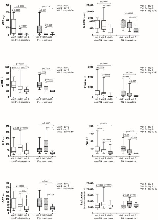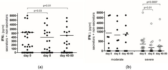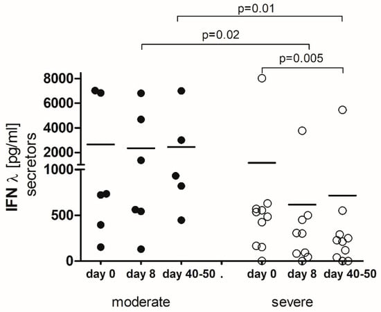 - Fukuda, Y.; Homma, T.; Inoue, H.; Goto, Y.; Sato, Y.; Ikeda, H.; Onitsuka, C.; Sato, H.; Akimoto, K.; Ebato, T.; et al. Serum IL-28A/IFN-λ2 is linked to disease severity of COVID-19. Sci. Rep. 2022, 12, 5458. [Google Scholar] [CrossRef] [PubMed]