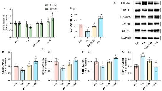 APA StyleWang, Y., Liu, S., Ying, L., Zhang, K., Li, H., Liang, N., Xiao, L., & Luo, G. (2024). Nicotinamide Mononucleotide (NMN) Ameliorates Free Fatty Acid-Induced Pancreatic β-Cell Dysfunction via the NAD+/AMPK/SIRT1/HIF-1α Pathway. International Journal of Molecular Sciences, 25(19), 10534. https://doi.org/10.3390/ijms251910534
