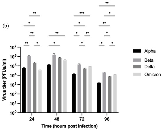 2.4. Replication Kinetics of SARS-CoV-2 Variants in Vero E6 Cells