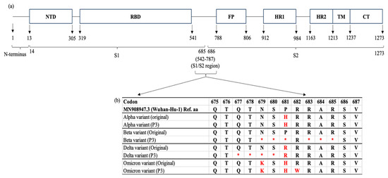 - Vu, M.N.; Lokugamage, K.G.; Plante, J.A.; Scharton, D.; Bailey, A.O.; Sotcheff, S.; Swetnam, D.M.; Johnson, B.A.; Schindewolf, C.; Alvarado, R.E.; et al. QTQTN motif upstream of the furin-cleavage site plays a key role in SARS-CoV-2 infection and pathogenesis. Proc. Natl. Acad. Sci. USA 2022, 119, e2205690119. [Google Scholar] [CrossRef]