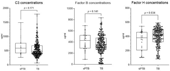 A statistically significant difference was identified in complement factor H concentration between women who delivered preterm and those who delivered at term. The concentration was 382 µg/mL in the former group, compared to 415 µg/mL in the latter (p = 0.034). Concentrations of complement C3 and factor B were observed to be higher in pregnant women who delivered preterm compared to women who delivered at term; however, the differences were not statistically significant, with p-values of 0.171 and 0.141, respectively (Table 1 and Figure 2).