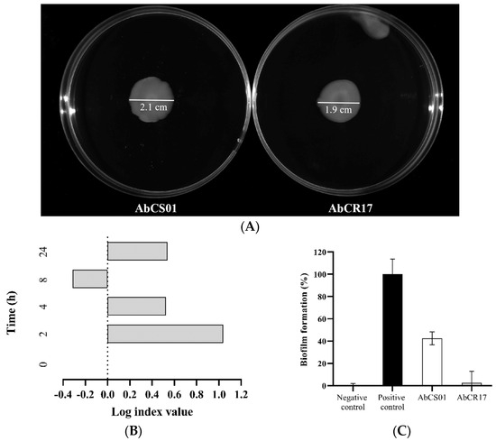 In vitro characterization of test strains (surface motility, competition index (CI), and biofilm formation) of the Acinetobacter baumannii AbCS01 and A. baumannii AbCR17 clinical strains. (A) Surface motility of the AbCS01 and AbCR17 clinical strains; (B) CI. Each bar in the graph represents the mean values of the Log index. A CI value equal to zero indicates no competition between the two species; a positive CI value indicates a competitive advantage for AbCR17, and a negative CI value indicates a competitive advantage for AbCS01. (C) Biofilm production of both clinical A. baumannii strains. Dark gray bar: negative control (A. baumannii AC001); black bar: positive control (A. baumannii ATCC19606); white bar: AbCS01; gray bar: AbCR17.