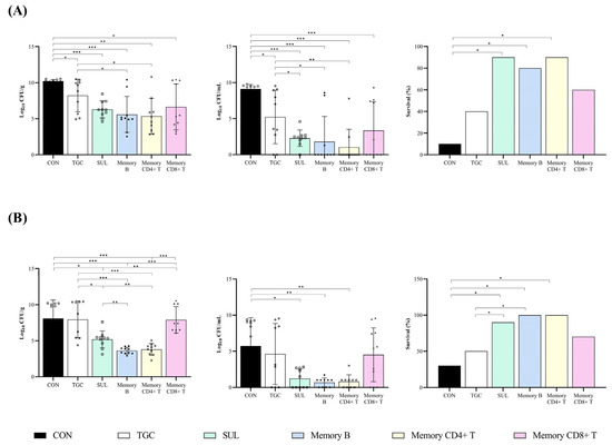 Bacterial concentrations in the lungs and blood and survival rates after treatment with antibiotics and the adoptive transfer of memory B and T lymphocytes in the pneumonia model with multidrug-resistant (MDR) A. baumannii CS01 and CR17 strains. (A) Bacterial concentrations in the lungs (left) and blood (medium) and survival rates (right) of mice infected with AbCS01; (B) bacterial concentrations in the lungs (left) and blood (medium) and survival rates (right) of mice infected with AbCR17. CON: untreated control group; TGC: tigecycline-treated group; SUL: sulbactam-treated group; Memory B: memory B lymphocyte-treated group; Memory CD4+ T: memory CD4+ T lymphocyte-treated group; Memory CD8+ T: memory CD8+ T lymphocyte-treated group. *: p < 0.05; **: p < 0.01; ***: p < 0.001.