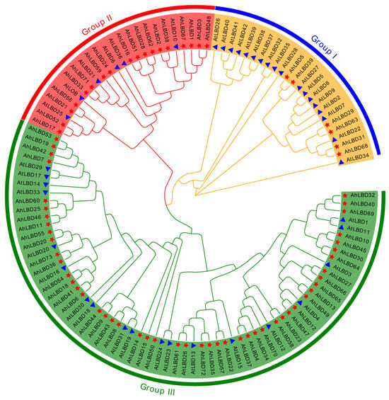 Phylogenetic tree of LBDs between A. hypogaea and A. thaliana. The Arabidopsis LBD protein sequences were downloaded from the TAIR database. The phylogenetic tree was constructed by the maximum likelihood method based on MEGA11 with 1000 bootstrap replicates performed. Red pentagram and blue triangle represent the peanut and Arabidopsis LBD genes.