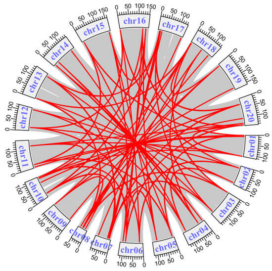 Collinearity analysis of the AhLBD gene family in A. hypogaea. Red lines represent colinear gene pairs of AhLBDs.