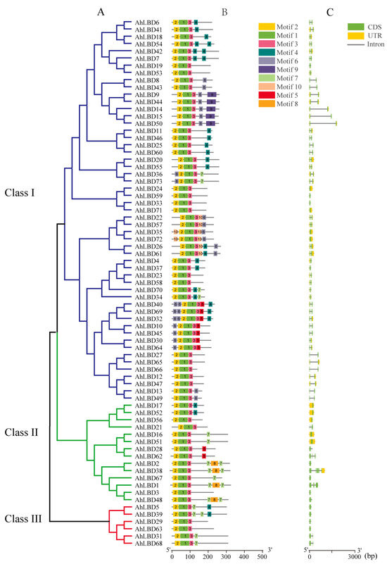 Phylogenetic tree, conservative motif, and gene structure analysis of all AhLBDs. (A) A maximum likelihood (ML) phylogenetic tree of A. hypogaea protein with 1000 bootstrap replicates was constructed based on the full-length sequence in MEGA11. (B) Distribution of conservative motifs in AhLBD proteins with colored boxes representing motifs 1–10. (C) The genetic structure of the AhLBD genes, including CDS (green rectangle), UTR (untranslated region, yellow rectangle) and intron (black line).