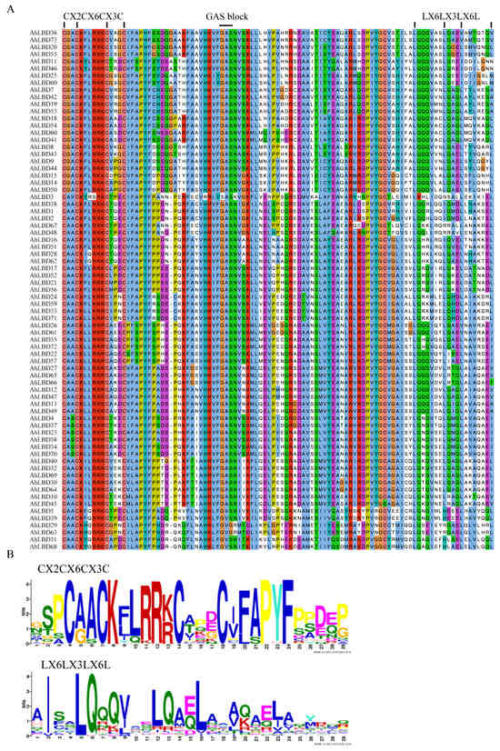 Multiple sequence alignment for 73 AhLBD proteins was performed using ClustalW. The analysis showed that all LBD proteins had a LOB region of approximately 100 amino acids at the N-terminus, which was highly conserved (see Figure 5A). All proteins contained a CX2CX6CX3C domain. A total of 26 AhLBDs contained a leucine zipper-like domain (LX6LX3LX6L) in Class I and Class II (see Figure 5B), but this domain was not present in Class III, indicating that Class III differs from Class I and Class II in biological function.