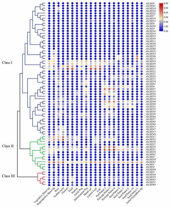 The expression level of AhLBD genes under cold (4 °C), heat (37 °C), salt (2% NaCl), and drought (20% PEG6000) stress for 24 h treatment were also detected (see Figure 12). The results showed that some AhLBD members were related to the regulation of abiotic stress, and different genes showed different expression trends. It was mainly concentrated in Class I and Class II for the four abiotic stresses. In addition, the expression of 31 out of all 73 AhLBDs were not detected under any abiotic stress.