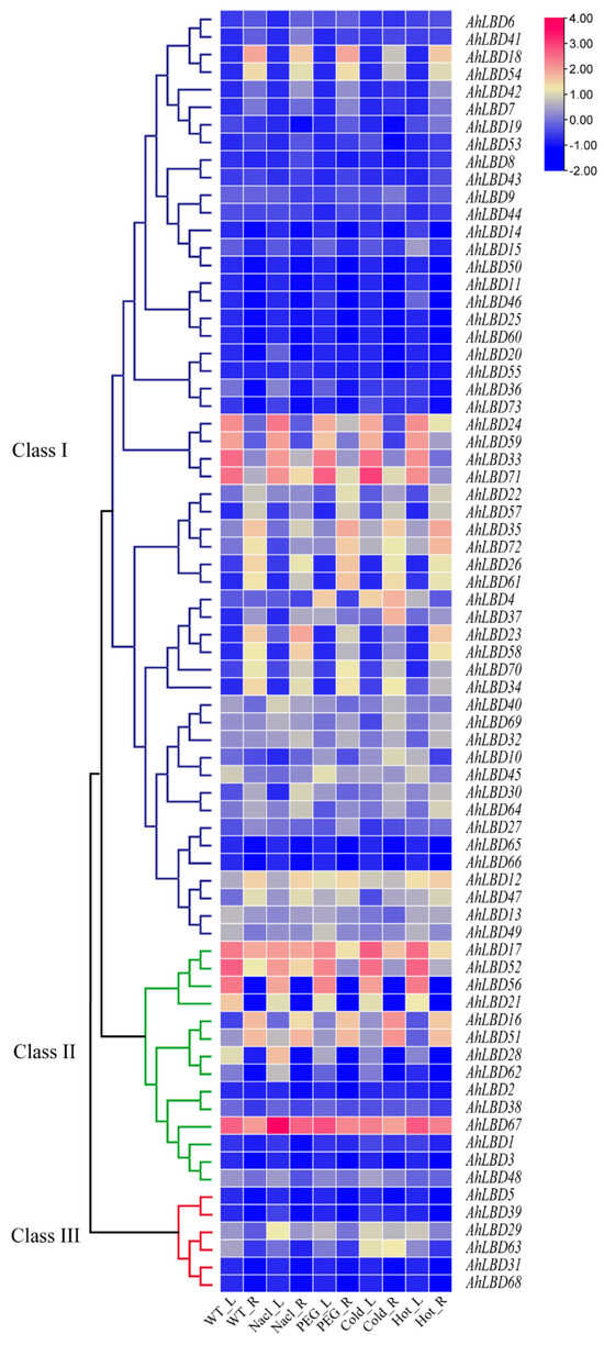 Expression profiles of AhLBDs under 2% Nacl, 20%PEG 6000, 4 °C cold, 37 °C hot with leaf and root. The gene names are shown on the right. Class I, II, and III represent three groups according to the phylogenetic tree. Scale bars on the right represent log2 (FPKM+1).