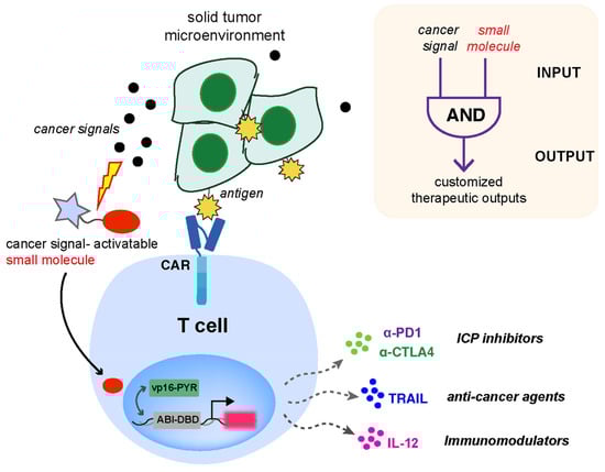 The potential of cancer immunotherapy using engineered T cells with chimeric antigen receptors (CAR) to eradicate targeted tumors has been demonstrated in several clinical trials and FDA approvals. Although CAR-redirected T-cell therapies have been successful in treating hematological malignancies, their application against solid tumors has proven challenging. One hindering factor is the difficulty of identifying tumor-specific antigens [1]. Current cancer-associated antigens are not exclusively expressed on tumor cells. When expressed in normal tissue, even a low-level expression could mount a devastating effect [2]. Even if a unique antigen for a solid tumor could be identified, T cells unfortunately become exhausted within the repressive tumor microenvironment (TME) [3]. The TME of solid tumors suppresses the proliferation of engineered T cells and their production of cytokines in favor of promoting tumor development. To overcome this hurdle, many strategies have been developed to potentiate the therapeutic functions of CAR-T cells against solid tumors. One approach involves the co-administration of CAR-T cells with additional therapeutic molecules capable of modulating the TME and CAR-T cell activity, such as cytokines or immune checkpoint inhibitors. However, such combination therapies can cause systemic toxicities due to the lack of control over the distribution of therapeutic effects [4]. Alternatively, many efforts have been dedicated to engineering “armored” CAR-T cells capable of the local delivery of biologics to alleviate systemic side effects. This has led to the development of T-cell redirected universal cytokine killing (TRUCK), an engineered CAR with tethered nuclear factor of activated T-cell (NFAT)-induced cytokine expression and secretion [5]. With TRUCKs, the CAR engagement of a cognate antigen leads to the activation of CAR and NFAT signaling, resulting in the NFAT-driven expression and subsequent secretion of cytokines, while without CAR activation, no cytokine release can occur. These cytokine-producing CAR-T cells have shown enhanced efficacy when delivering IL-12 [6,7], IL-15 [8], IL-18 [9], or IL-21 [10] to the TME. Recently developed “synNotch” T cells demonstrated a general platform to conditionally deliver custom response programs to remodel the local microenvironment, in response to a user-selected antigen [11]. Although these designs can provide a flexible way to engineer a customized and localized immune response program, such systems are greatly dependent on antigen-driven T-cell activation, which may not be effective when tumors lose or downregulate their antigen expression as a mechanism of tumor immune escape. Also, the inevitable antigen expression in normal tissues can result in off-tumor toxicity mediated by the non-selective delivery of biologics and enhancement of CAR-T cell activities.