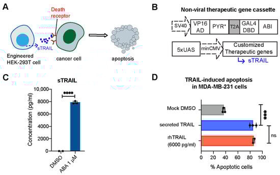 To develop T cells capable of locally delivering desired therapeutic effects, we first constructed an ABA-inducible gene expression system controlling the expression of a therapeutic gene encoding secreted tumor necrosis factor-related (TNF) apoptosis-inducing ligand (sTRAIL) (Figure 2A,B). TRAIL is a selective inducer of apoptosis in many transformed cells bearing death receptors and has been a promising candidate for cancer therapy [20,21,22]. This ABA-inducible gene expression system uses ABA to induce the heterodimerization of the ABI-fused yeast GAL4 DNA-binding domain (GAL4DBD) to the PYL/PYR-fused herpes simplex virus VP16 transactivation domain (VP16AD). The ABA-induced reconstitution of functional transcriptional activator will lead to the expression of GAL4DBD-targeted genes (e.g., sTRAIL) [12]. The PYR mutant (PYR*) developed in our previous research [16] was incorporated to offer an enhanced ABA potency. We co-transfected HEK-293T cells with the plasmids of ABA-inducible sTRAIL and the split transcriptional activator (VP16AD-PYR*-T2A-GAL4DBD-ABI) for 24 h, and then treated cells with or without ABA. At 24 h post-treatment, the secretion of sTRAIL in culture media was quantified by the enzyme-linked immunosorbent assay (ELISA). Cells that are treated with ABA secreted a high level of TRAIL, as shown in Figure 2C. To validate the biological activity of secreted TRAIL, MDA-MD-231 cells (expressing the death receptor) were incubated with culture media containing ABA-induced sTRAIL or commercial recombinant human TRAIL for 24 h, and the death of target cells (as a result of apoptosis) was measured by flow cytometry via annexin V-FITC staining. Propidium iodide (PI) staining was used to quantify necrotic cells and differentiate from the apoptotic cells. We observed an increase in apoptotic cells when cancer cells were incubated with ABA-induced sTRAIL, which showed comparable efficacy as the case when treated with commercial recombinant human TRAIL (Figure 2D). These results confirmed the feasibility of this ABA-inducible expression system to produce antitumor biologics.