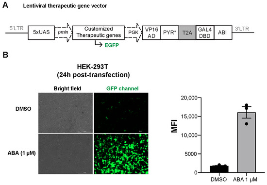 Generation and validation of recombinant lentiviral vector-encoding inducible gene cassette. (A) Lentiviral vector of ABA-inducible gene expression system. (B) ABA-induced EGFP expression in transfected HEK-293T cells. Cells were treated with 0.5% DMSO or 1 µM ABA, and the induced EGFP expression was observed under a fluorescence microscope after 24 h. The scale bar is 200 µm. Mean fluorescence intensity (MFI) was calculated from 3 random areas in a well using microscope-integrated cellular analysis tool. Error bars are mean ± S.E.M.