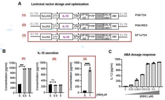 As a hallmark of inflammatory cytokines, interleukin 12 (IL-12), a heterodimeric protein composed of p35 and p40 subunits, plays an important role in bridging innate and adaptive immunity. IL-12 is mainly produced by innate immune cells such as macrophages, dendritic cells, and neutrophils, and has been known as a critical regulator of cell-mediated immunity [23]. Various pre-clinical models have demonstrated that IL-12 modulates antitumor responses at various levels, for example, through the induction of TH1 differentiation [24], sustaining survival and re-activation of CD4-T cells [25], and enhancing cytolytic activity of NK cells and CD8 T cells [26]. Therefore, local production of this therapeutic agent will activate innate immune cells, which in turn will maximize the antitumor response in the targeted tumor lesion while avoiding substantial systemic toxicities associated with the high serum level of IL-12 observed in clinical trials [27]. With that in mind, we generated a lentiviral vector for inducible IL-12 expression and secretion upon ABA treatment by replacing EGFP from the N103-iEGFP with the IL-12 gene [11] (i.e., PGK/T2A in Figure 4A). We explored different ways of designing the constructs to obtain the best signal-to-noise induction of the therapeutic gene expression. In one version, the 2A sequence was replaced by an internal ribosome entry site (IRES) and still driven by the PGK promoter (i.e., PGK/IRES, Figure 4A). The 2A-linked genes were expected be expressed at an equal level, while the IRES-mediated bicistronic vector expressed the proteins at different levels, with a lower expression level in the IRES-driven gene [28]. Additionally, the 2A elements are much shorter than IRES, with only 60 to 80 base pairs, which should increase the viral packaging efficiency. Another version was made by replacing PGK with the human elongation factor-1 alpha (EF1α) promoter (i.e., EF1α/T2A, Figure 4A), which is commonly used in viral vector expression systems. We tested the ABA CIP-controlled inducibility in the secretion of IL-12 in human Jurkat T cells using the ELISA assay. These lentiviral vectors were transiently transfected into HEK-293T cells along with two other helper plasmids (i.e., packaging and envelope) to generate lentiviruses, which were then used to infect Jurkat T cells. At day 4 post-transduction, transduced Jurkat cells were treated with or without ABA for 24 h and the amount of IL-12 secreted in the cell culture media was quantified via ELISA. Comparing these three designs, we observed that the PGK/IRES version failed to induce IL-12 production upon ABA treatment as compared to the PGK/T2A version under the control of the same promoter (Figure 4B), which may be due to the differential expression of the two split transcriptional activator components in the IRES case. The EF1α/T2A version resulted in the most optimal inducibility with minimal basal transcriptional activity, which we identified as the most ideal design to move forward. The differential effects between using EF1α and PGK promoters indicated that intricate cellular regulation on promoters should be considered for future optimization. Therefore, we adopted this vector configuration for constructing other therapeutic protein expression vectors. Additionally, the ABA-based CIP system has been reported to yield dosage-dependent controls in biological outputs [29]. To examine whether the amount of IL-12 expression is titratable by varying ABA concentrations, Jurkat T cells were transduced with inducible IL-12-encoding EF1α/T2A lentivirus and treated with ABA at different concentrations ranging from 0 to 1000 nM for 24 h before quantifying IL-12 in the media using ELISA. We observed that there was a clear ABA-dependent dosage response with a maximum induction at around 250 nM (Figure 4C). This system can potentially provide an important tool to fine-tune the secreted IL-12 dosage to achieve substantial efficacy without severe adverse effects.