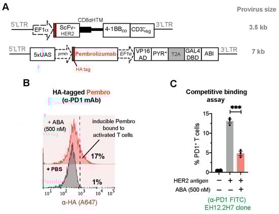 To counteract the negative effect of TME on CAR-T function, combining CAR-T and ICP blockades has been proven an efficacious treatment approach against solid tumors [35,36,37,38]. ICP inhibitors, delivered either through the constitutive expression by CAR-T cells or systemic administration, come with several adverse effects. Toxicities associated with ICP blockades include, but are not limited to, the increased activation of autoreactive T cells due to systemic blocking of ICP pathways. A potential way to circumvent current systemic toxicities while enhancing the effectiveness of ICP inhibitors is to have T cells locally produce these therapeutics in tumors. Amongst the ICP inhibitors developed so far, blocking programmed cell death protein 1 (PD-1) expression on activated T cells using the clinically approved monoclonal antibody pembrolizumab (α-PD1 mAb) has achieved remarkable successes in treating various solid cancers and lymphomas [39,40,41]. PD-1 binds programmed death ligand 1 (PD-L1), which is expressed on many tumor cells, resulting in the suppression of T-cell proliferation and cytokine production and correlating with the expression of “T-cell exhaustion” markers such as LAG-3, TIM-3, and CD160 [42]. Thus, we developed CAR+ cells capable of secreting pembrolizumab (hereafter “Pembro”) directed against PD-1 in response to ABA induction. To test the production of Pembro, we used a cell-based flow cytometry binding assay in which the secreted Pembro binds to the target cell surface antigen PD-1, and the bound Pembro can then be analyzed by flow cytometry. Pembro [11] was cloned into the ABA-inducible lentiviral vector, which also contains an HA tag for detection purposes (Figure 6A). Jurkat T cells were transduced by lentiviruses to co-express the HER2-CAR and the inducible Pembro (CAR+iPembro), and the transduced cells were co-incubated with HER2-expressing MDA-MB-231 cancer cells, which triggered PD-1 expression on the activated CAR-Jurkat cells. These cells were treated with 500 nM ABA or PBS (as a control) for 24 h, and the secretion and binding of Pembro to PD-1 was then detected using flow cytometry by staining Jurkat cells with fluorophore-conjugated α-HA antibodies. The increase in the HA fluorescence signal indicated the expression and secretion of Pembro and its binding to PD-1 on CAR+iPembro Jurkat cells only in the presence of ABA, but not PBS (17% vs. 1%) (Figure 6B). We also confirmed the satisfactory expression of HER2-CAR when co-transduced with the inducible Pembro expression circuits (Figure S2B). To confirm that the secreted Pembro specifically bound to PD-1 on activated Jurkat cells, we performed a competitive binding assay using a commercially available α-PD1 antibody (clone EH12.2H7) to measure the levels of free PD-1 on the cell surface. The commercial α-PD1 antibody has been shown to bind to the same epitope on PD-1 as Pembro [43]; therefore, any binding between Pembro and PD-1 will interfere with the binding of the commercial α-PD1 to PD-1. CAR+iPembro cells in the co-culture treated with either ABA or PBS for 24 h were stained for PD-1 using FITC-conjugated α-PD1 antibody (α-PD1 FITC). The percentage of PD-1-positive cells was determined using flow cytometry. As shown in Figure 6C, the percentage of PD1-positive Jurkat cells was significantly lower in the ABA-treated group, suggesting that Pembro was present and occupied PD-1 on the Jurkat cell surface, which blocked the interaction between the commercial α-PD1 antibody and PD-1. It was also observed that CAR+iPembro Jurkat cells without co-culturing with HER2+ tumor cells did not express PD-1 due to lack of tumor-mediated T-cell activation.