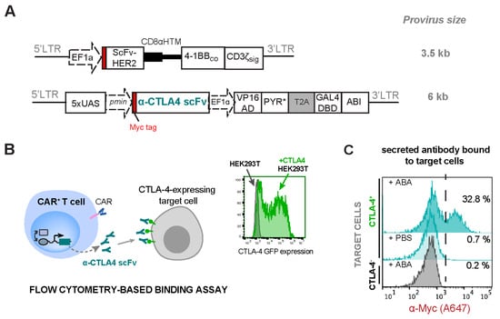ABA-inducible expression of immune checkpoint blockage α-CTLA4 scFv in CAR-expressing Jurkat T cells. (A) Lentiviral constructs for HER2-CAR and ABA-inducible α-CTLA4 scFv. (B) The secreted α-CTLA4 scFv in the cell culture supernatant was detected using flow cytometry-based binding assay and HEK-293T target cells overexpressing the CTLA4 ligand. The scFv-ligand binding was followed by staining target cells with A647-conjugated α-Myc antibody for detection of the bound scFv to target cells. (C) Flow cytometry data showing the induced expression and secretion of α-CTLA4 scFv upon the addition of 500 nM ABA or PBS and selective binding of the scFv to CTLA-4+ cells. The shown histogram is a representative of 3 biological replicates.