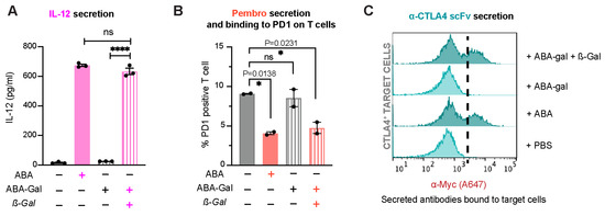 Next, we examined if this prodrug strategy can be integrated into our platform that allows engineered T cells to analyze and respond to β-gal and activate custom immunomodulating programs. Jurkat T cells were transduced to express HER2-CAR along with different ABA-inducible gene cassettes, as described above, followed by the treatment with 500 nM ABA or 500 nM ABA-Gal with or without 100 nM β-gal for indicated time periods. Using the same assays developed for testing each therapeutic protein, as described above, we observed that the production and secretion of IL-12, Pembro or α-CTLA4 scFv were only detected when cells were treated with ABA or with ABA-Gal plus β-gal, suggesting that β-gal reliably activated ABA-Gal to produce ABA, which in turn triggered the production of therapeutic proteins (Figure 9). These data established that β-gal can trigger engineered Jurkat T cells to express different therapeutic and immunomodulatory modalities.