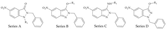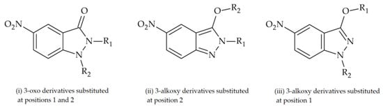 The evaluation of indazoles as antiprotozoal agents began with the study of new safe and effective drug candidates for the treatment of Chagas disease, mainly due to their chemical similarity with the reference drugs used in clinical practice []. These first reported compounds exploited the combination of an indazole ring and a 5-nitro group due to their previously demonstrated antiprotozoal properties [,]. Three series of compounds were designed using different substituents on both the carbon and nitrogen atoms.