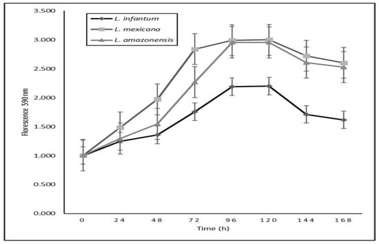 Promastigote cultures of L. infantum, L. amazonensis, and L. mexicana were adjusted to 106 promastigotes/mL. Seven plates with 96 wells were seeded at 200 μL/well and incubated at 26 °C. A total of 32 replicates/plate were prepared for each species. Every 24 h, 20 μL/well of a 3 mM resazurin solution prepared in sterile PBS (Phosphate Buffer Solution) was added. The reading was performed at 540 nm excitation and 590 nm emission wavelengths after 8 h of incubation in a 96-well plate reader (SUMA®, Habana, Cuba). The mean daily fluorescence was obtained for each species and plotted as a function of time (hours).