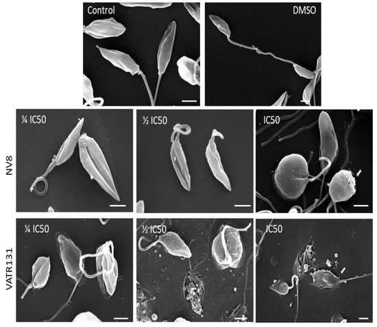 Scanning electron microscopy of NV8 (IC50 = 0.007 μM, ½ IC50 = 0.0035 μM, ¼ IC50 = 0.0017 μM) and VATR 131 (IC50 = 2.13 μM, ½ IC50 = 1.065 μM, ¼ IC50 = 0.53 μM) against promastigotes of L. amazonensis. Scale bar = 0.5 µm.