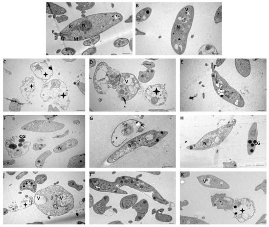 Transmission electron microscopy of L. amazonensis promastigotes after 72 h of incubation: Control Group (A), DMSO 0.1% (B), IC50 = 0.007 μM (C–E), ½ IC50 = 0.0035 μM (F–H), and ¼ IC50 = 0.0017 μM (I–K) of NV8 compound. Scale bar = 0.5 µm. Flagellum (F), Flagellar Pocket (FP), Kinetoplast (K), Nucleus (N), Mitochondria (M), Cytoplasmic Vacuoles (V), Dead Parasites (black star), Deformed Flagellar Pocket (*), Dead Parasites with extruded cytoplasm (+) and Cytosolic Granules (CG).