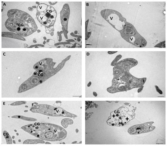 Promastigotes were washed with PBS and fixed with 2.5% glutaraldehyde solution for 1 h at 4 °C. They were then fixed with a solution of 1% OsO4 in the same buffer at 4 °C and in darkness for 1 h. Promastigotes were washed with PBS at RT and dehydrated in an ethanolic solution in increasing order by up to 100%. They were then included in the epoxy resin using specific molds for polymerization and maintained at 60 °C for a minimum period of 72 h. The blocks were cut with an ultramicrotome (Reichert Jung, Austria) into thin sections. The slices were stained with uranyl acetate and lead citrate and subsequently micrographed using a JEM 1400 transmission electron microscope (JEOL, Ltd., Tokyo, Japan).