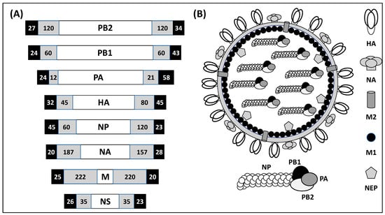 IAVs are negative-sense, single-stranded RNA viruses of negative polarity (Figure 1). IAV virion is made of the two major viral glycoproteins, hemagglutinin (HA), encoded by segment 4; and neuraminidase (NA), encoded by segment 6, responsible for viral entry and release from infected cells, respectively. Also, in the virion is located the ion channel matrix 2 (M2) protein, encoded by the M segment 7, that is important in the initial steps of viral replication. Under the viral envelope is the matrix 1 (M1) protein, also encoded by the M segment 7, that is essential for viral budding. Inside the viral particle locates the 8-genome viral (v)RNA segments (PB2, PB1, PA, HA, NP, NA, M, and NS) that are encapsidated by the viral nucleoprotein (NP), encoded by segment 5, and associated to one copy of the viral polymerase subunits that form the viral ribonucleoprotein (vRNP) complexes. The viral RNA-dependent RNA polymerase (RdRp) complex is formed by three polymerase subunits: PB2, encoded by segment 1; PB1, encoded by segment 2; and PA, encoded by segment 3, and are involved in viral genome replication and gene transcription [13,14,15]. Under the viral envelope is also the nuclear export protein (NEP), encoded by NS segment 8, that is required for the nuclear export of vRNP complexes from the nucleus to the cytoplasm of infected cells. Flanking the coding regions in each of the vRNA segments are the 3′ and 5′ non-coding regions (NCRs) important for viral replication and transcription [14,15]. In addition, the 3′ and 5′ ends of the coding regions contain the packaging signals that are required, together with the NCR, for the encapsidation of the viral genome into nascent viruses [13,14,15].