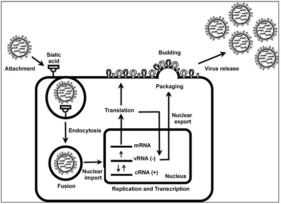IAV life cycle can be divided into viral attachment to the sialic acid receptor, entry of the virus into the cell using an endocytosis-mediated mechanism, fusion of the virus membrane with the membrane of the endosome, nuclear export of vRNAs from the cytoplasm to the cell nucleus, viral replication and transcription, nuclear export of vRNAs from the nucleus to the cell cytoplasm, packaging of vRNAs into nascent virions, budding of new viral particles, and virus release from infected cells (Figure 2) [16,17]. The first step in the IAV life cycle starts with the attachment of the viral particle to sialic acid cellular receptors present in susceptible cells, a process mediated by the viral HA [18]. In general, avian IAV recognizes α-(2,3), while mammalian AIV recognizes α- (2,6) sialic acid receptors containing glycoproteins. The ability of swine IAV to recognize both α-(2,3) and α-(2,6) sialic acid receptors is the reason why swine species represent a mixing vessel for avian and mammalian IAVs and the concern for the origin of new IAVs with pandemic potential [19,20,21]. After attachment to the sialic acid-containing receptor, IAV enters the cell using a receptor-mediated endocytosis mechanism [22]. Then, acidification of the pH of the endosome, a process mediated by the viral M2 protein, triggers a conformational change in the viral HA that allows the fusion of the membrane of the virus with the membrane of the endosome [23,24]. This fusion event results in the release of vRNPs into the cell cytoplasm [23]. Once in the cytoplasm, the vRNPs are translocated to the nucleus where viral replication and transcription take place [25]. Nuclear import of vRNPs is a process mediated by the interaction of the nuclear localization signal (NLS) of IAV proteins that make the vRNP complexes (PB2, PB1, PA, and NP) with karyopherin-like importin α and β [25]. Inside the nucleus, the negative-sense vRNA is first transcribed into a positive-sense mRNA that is translated into viral proteins. The same negative-sense vRNA serves as a template to provide a complimentary copy of positive-sense RNA (cRNA) that is used to generate new vRNAs that will be incorporated into nascent virions [15,25]. Viral genome replication and gene transcription is mediated by the viral polymerase subunits PB2, PB1, and PA, together with the viral NP [15,25]. Newly generated vRNAs are next exported to the cell cytoplasm using a Crm1-dependent pathway, a process mainly mediated by interaction of the viral NEP with Crm1 and M1 [26,27]. Once in the cytoplasm, the vRNAs are selectively packaged into nascent virions [28]. Specific packaging of newly synthesized vRNAs into IAV is a process mediated by the packaging signals located at the 3′ and 5′ NCRs of each of the viral segments. This specific packaging mechanism guarantees the incorporation of one copy of each of the vRNAs into new virions [29,30,31]. Next, IAV particles leave the infected cells from the apical side using a budding mechanism [32,33]. Budding of newly synthesized virions from infected cells is mainly mediated by the interaction of the M1 protein with newly synthesized vRNPs and viral glycoproteins in the membrane of infected cells [34,35]. Cleavage of sialic acid residues from newly synthesized HA present in budding virions is required for the release of IAV from infected cells, a process mediated by the viral NA [36,37].