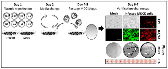 Plasmid-based reverse genetics to generate rIAV: Conventional reverse genetics to generate rIAV is based on the use of 8 plasmid DNAs. Each of the viral plasmids uses an ambisense strategy to encode the vRNAs and the viral proteins under Pol I and Pol II promoters, respectively. To rescue rIAVs, the 8 ambisense plasmids are co-transfected into co-cultures of 293T and MDCK cells (Day 1). After transfection, the cell culture supernatant is replaced by fresh media containing TPCK-trypsin (Day 2). At 2–3 days after transfection, the cell culture supernatant is collected and used to infect new MDCK cells or 8–10 chicken embryonated eggs (Day 4–5). Then, 2–3 days after infection, cell culture supernatant from infected MDCK cells or the allantoic fluid from chicken embryonated eggs is harvested to confirm the presence of rIAV. Detection of rIAV can be determined by evaluating cytopathic effect (CPE); immunofluorescence (IFA), using IAV-specific antibodies, or fluorescence assay (FA) if fluorescent-expressing viruses are rescued. Plaque assay with/without immunostaining with IAV-specific antibodies and fluorescence analysis is used to confirm expression of the reporter gene from all the recombinant viruses in the preparation (arrows indicate correlation between IAV viral NP and mCherry expression). Alternatively, a conventional hemagglutination assay (HA) can be used to demonstrate the presence of rIAV in the cell culture supernatants or allantoic fluid from MDCK and eggs, respectively [8,61]. IFA/FA scale bars 200 µm.