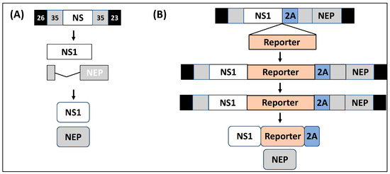 rIAV expressing reporter genes from different vRNA segments have been described in the literature, including fluorescent and luciferase reporter genes [53,55,62,63,64,65,66,67,68,69,70]. Among those, rIAV expressing reporter genes from the NS segment have been shown to represent an excellent option to track IAV infection in vitro and in vivo, eliminating the need for secondary approaches to identify the presence of the virus (Table 1) [9,55,56,71,72,73]. Some of the advantages of expressing reporter genes from the viral NS segment include its small size (~890 nt) and therefore its potential ability to tolerate bigger insertions compared to other vRNA segments; the ability to express reporter genes without the need for disrupting and duplicating packaging signals located at the 3′ or 5′ end of each vRNA for efficient virion assembly; its ability to maintain the inserted reporter gene since other replication-competent rIAVs have been shown to easily lose reporter gene expression after viral passaging; and the high levels of NS1 expression during viral infection. Because of all these advantages, the NS segment of multiple IAV strains has been used for developing reporter-expressing rIAV due to the deep knowledge accumulated about the expression strategy of the NS segment and the functions of its gene products (Table 1). Importantly, recombinant constructs need to maintain intact the NCRs of viral genes and the packaging signals to recover infectious viruses. Figure 4 shows one of the strategies used to modify the NS segment to generate reporter-expressing rIAV. In this strategy, the NS segment is modified to encode NS1 and NEP from a single non-overlapping transcript. To that end, the overlapping region of the viral genome encoding the N-terminal 10 amino acids shared between NS1 and NEP is duplicated, and the porcine teschovirus 1 (PTV-1) 2A autoproteolytic cleavage site is inserted between the NS1 and NEP ORFs. This strategy ensured that NS1 and NEP are translated as two separate, non-overlapping, independent ORFs. However, the IAV NS segment has also been modified using other strategies to encode reporter genes or foreign sequences, including the insertion of two 2A autoproteolytic cleavage sequences for the individual expression of viral proteins and the reporter gene [44,45,57,73]. Likewise, expression of foreign reporter genes has been accomplished using caspase recognition sites and stop/start sequences [74,75]. Notably, there have not been reported differences in the life cycle of natural isolates of IAV, or wild-type rIAV, and reporter-expressing rIAV.