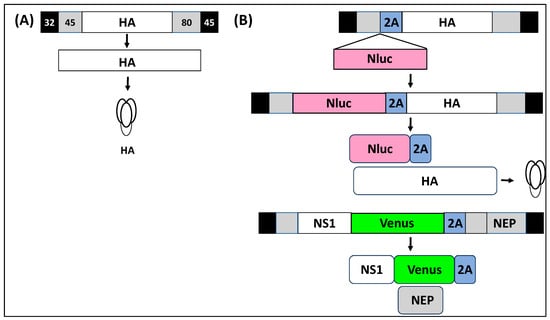 rIAV with modified NS and HA segments to express reporter fluorescent and luciferase genes. (A) IAV HA segment: IAV segment 4 encodes the viral HA (white box). At the 3′ and 5′ ends of the NS segment are the NCRs (black boxes) involved in viral genome replication and gene transcription. Inside the coding region are the 3′ and 5′ packaging signals (gray boxes) required, together with the NCRs, for efficient incorporation of the HA segment into nascent virions. (B) Modified IAV HA segment: In the case of the modified IAV HA segment, Nluc (pink box) is inserted as a fusion to the viral HA separated by the PTV-1 2A autoproteolytic cleavage site (blue box). The modified IAV NS segment to generate the BIRFLU IAV is identical to the one described in Figure 4. HA and NS modified segments are transcribed as single transcripts and translated as a single polyprotein. NS1 fused to Venus is separated from the NEP after cleavage in the PTV-1 2A site. Likewise, Nluc is separated from the viral HA after cleavage in the PTV-1 2A site. The 2A peptide remains fused at the C-terminal of the NS1–Venus fusion (green box, NS segment) and Nluc (HA segment).