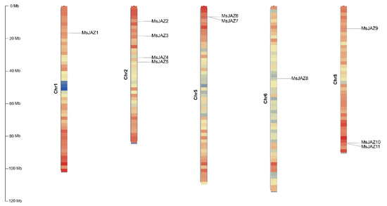 Chromosomal distribution diagram of alfalfa the JAZ gene. TBtools (v1.108, Chen, C., GZ, China) was used to visualize the position of each MsJAZ on the chromosome. Eleven MsJAZs are mapped onto the five chromosomes of Medicago sativa. The vertical bars represent the chromosomes of alfalfa. The scale on the left indicates the chromosome length (Mb). Color gradients indicate gene density, and red to blue indicate gene density from high to low. Each MsJAZ gene is labeled at its respective position on the chromosomes.