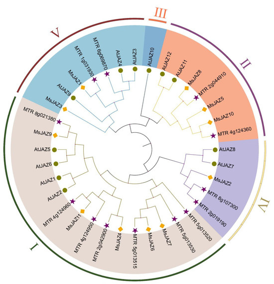 Phylogenetic tree of the JAZ genes in M.sativa, M. truncatula, and A. thaliana. The phylogenetic tree was constructed using the maximum likelihood method (bootstrap method with 1000 replications was selected) of MEGA 6.0 software. JAZ genes were divided into five groups (I–Ⅴ) according to the known Arabidopsis JAZ family, and were represented using different colors. Using different markers to distinguish each species, yellow diamonds, purple stars, and green circles, respectively, represent M. sativa, M. truncatula, and A. thaliana.