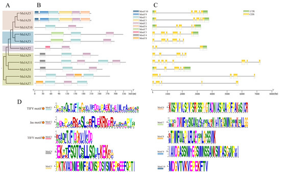 Phylogenetic relationships, motif compositions, and structures analysis of the MsJAZs family. (A) The phylogenetic tree of MsJAZs of M. sativa was constructed by the maximum likelihood method of MEGA 6.0 software. All MsJAZs were divided into four groups and represented by different colors. (B) The motif composition of MsJAZs was analyzed with the MEME program. A different color is used for each motif. (C) The UTR, CDS, and intron organization of MsJAZs. The green boxes, yellow boxes, and thin black lines represent UTRs, CDSs, and introns, respectively. (D) Sequence logos of motifs 1–10. Motif 1 and motif 3 represent the TIFY motif, and motif 2 represents the Jas motif.