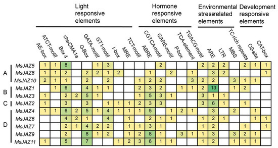 Prediction of cis-acting elements of MsJAZ genes. (A–D): MsJAZ genes were divided into four groups. Cis-acting elements are divided into light, hormones, environmental stress, and development response elements. The digit represents the number of elements.