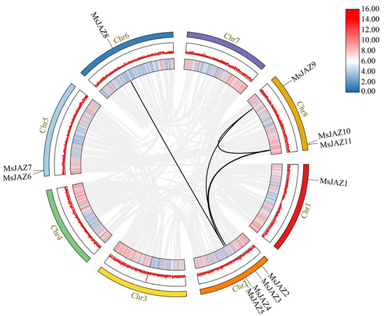 Schematic diagram of the syntenic relationships of MsJAZ genes in M. sativa. The outermost colored circles represent the eight chromosomes of alfalfa, and the position of the MsJAZ genes on the chromosome is marked on the circle. The gray lines show the syntenic regions in alfalfa genome, and the black lines indicate JAZ gene pairs in segmental duplication events. The innermost and the middle circles represent the density and abundance of genes at that location on the chromosome.