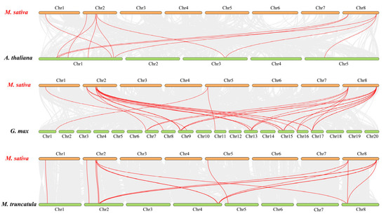 Synteny analysis of JAZ genes between M. sativa and three representative plant species. The orange boxes represent the chromosomes of M. sativa, and the green boxes represent the chromosomes of A. thaliana, G. max, and M. truncatula. Gray lines in the background indicate collinear blocks between alfalfa and the indicated plant, while the red lines indicate the duplication of JAZ gene pairs.