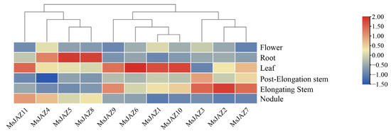Expression analysis of MsJAZ genes in different tissues (flowers, roots, leaves, post-elongating stems, elongating stems, and nodules). The legend represents the relative expression levels, blue indicates low expression levels and red indicates high expression levels.