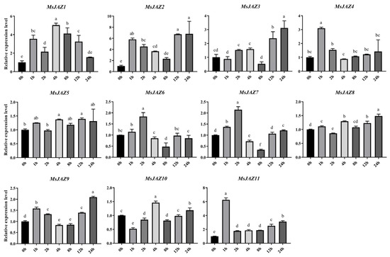 Expression patterns of 11 MsJAZ genes under 200 mM NaCl treatment. The horizontal coordinates represent processing times, and the vertical coordinates represent relative expression levels. The error bars represent the standard error of the means of three independent replicates. ANOVA with p < 0.05. There are significant differences between different letters (a–f).
