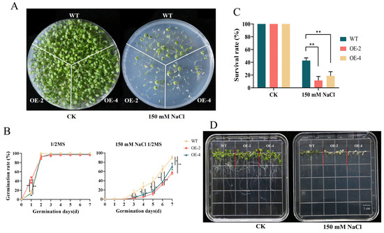Analysis of salt resistance overexpressing MsJAZ1 in Arabidopsis. (A–C) The growth of the WT and OE lines of Arabidopsis overexpressing MsJAZ1 on a plate germinated for 20 days treated with CK and 150 mM NaCl. The statistical survival rate is shown in (C). The bottle green, orange, and yellow columns represent WT, OE-2, and OE-4, respectively. The asterisk on the column indicates a significant difference between WT and transgenic lines (* p < 0.05; ** p < 0.01, t-test). (B) Statistical analysis of the germination rate of Arabidopsis WT and OE lines overexpressing MsJAZ1 from 0 to 7 days under CK and 150 mM NaCl treatment. The yellow, orange, and bottle green lines represent WT, OE-2, and OE-4, respectively. The asterisk on the column indicates significant difference between WT and transgenic lines (* p < 0.05; ** p < 0.01, t-test). (D) Salt tolerance analysis of WT and transgenic lines at the seedling stage.
