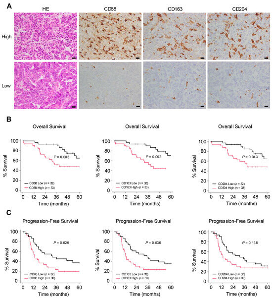 Number of infiltrating macrophages correlates with poor prognosis in ovarian cancer. (A): Immunohistochemistry for the detection of pan-macrophage marker CD68 and tumor-associated macrophage (TAM) markers CD163 and CD204 was performed in 65 human high-grade serous ovarian carcinoma (HGSOC) tissues, and the respective positive cells were counted in high-power fields (three images/case). Patients were subsequently categorized into high or low groups based on the median of the average count of infiltrating macrophages. (B,C): Kaplan–Meier analysis of (B) overall survival (OS) in 65 patients with HGSOC with low (n = 32) and high (n = 33) counts and of (C) progression-free survival (PFS) in 62 patients with HGSOC with low (n = 32) and high (n = 30) counts, based on low- and high-level CD68, CD163 and CD204 expression. p-values were determined using the log-rank test. Scale bar: 20 µm (A).