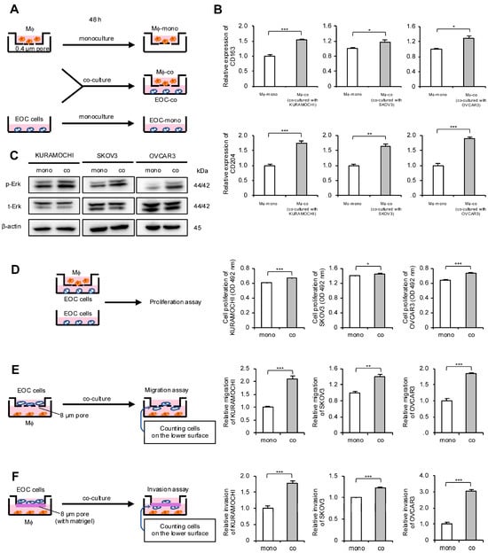 Co-culture of macrophages and epithelial ovarian cancer (EOC) cells promotes polarization of macrophages into TAMs and enhances malignant phenotypes of EOC cells. (A): Indirect co-culture of EOC cells (KURAMOCHI, SKOV3 and OVCAR3) in the lower chamber and macrophages in the transwell assay with 0.4 µm pores was performed for 48 h. For comparison, EOC cells and macrophages were also cultured alone for 48 h as monocultured controls. (B): Expression of TAM markers CD163 and CD204 was compared using real-time quantitative PCR (qPCR) between monocultured and co-cultured macrophages. (C): Expression of extracellular signal-regulated kinase (Erk) and phosphorylated Erk (p-Erk; Thr202/Tyr204) in monocultured and co-cultured EOC cells was evaluated using Western blotting. β-actin was used as a control. (D): MTS assays were performed to compare the proliferation of monocultured and co-cultured EOC cells. (E): Transwell migration assays were performed to compare monocultured and co-cultured EOC cells. After 48 h of incubation, migrating cells into the lower surface were counted in five random fields per chamber. Representative images are shown in Figure S2A. (F): Transwell invasion assays were performed to compare monocultured and co-cultured EOC cells. After 48 h of incubation, invading cells into the lower surface were counted in five random fields per chamber. Representative images are shown in Figure S2B. Mϕ, macrophages. * p < 0.05, ** p < 0.01, *** p < 0.001.